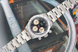A very rare in extremely good condition 1979 Rolex Oyster Cosmograph “Daytona” reference 6265 aka "Big Red" - due to it's big red "Daytona" printing - with a very nice inverse panda black matte dial with light patina lume plots and matching hands. The watch is in excellent condition showing very light signs of age and or scratches. All watches are checked by our watchmaker and guaranteed 3 months, 1 year if serviced. This reference has been serviced and is mechanically guaranteed 1 year.