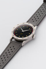 Finally all watches are made of 316L stainless steel, tested for 5ATM, 36mm without crown, 20mm between lugs, 8,5mm thick, powered by a modified Swiss Sellita SW210 manual mouvement with 42 hours power reserve. This watch comes on a Atelier Romane 20mm Racing grey leather strap and a Forstner Official 7-rows 20mm -vintage inspired- beads of rice stainless steel bracelet as well as a leather 'travel" single watch case.