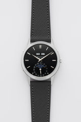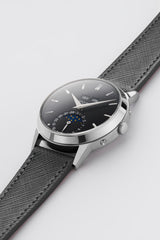 The dial is a masterclass in elegant minimalism, balancing complex functionality with a clean, refined aesthetic. Rendered in a delicate black hue, it brings a subtle warmth and vintage charm to the design. Featuring applied, sharp faceted arrow-shaped hour markers and matching dauphine-style hands, the dial is beautifully proportioned, with a subtle painted minute track encircling the outer edge between the indices, as seen on the fourth series — a departure from previous executions featuring incrusted half-spheres, also known as minute pearls. Two apertures below 12 o’clock display the day and month, while a charming moonphase and date sub-dial grace the 6 o’clock position, adding visual depth without overwhelming the design. The absence of clutter, combined with Archiwatch’s signature attention to detail — from the crisp typography to the perfectly balanced layout — results in a dial that exudes timeless sophistication.
