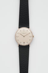 The Audemars Piguet reference 5139BC, produced in the 1960s, is a refined expression of mid-century elegance and technical finesse, showcasing the brand’s mastery of ultra-thin watchmaking. Crafted in 18k white gold, the watch exudes quiet sophistication, its minimalist round case and slender profile emphasizing purity of form over ornamentation. The silvered dial, subtly radiant, is elevated by factory-set diamond hour markers that lend a touch of understated luxury without compromising the watch’s timeless restraint. At its heart beats Audemars Piguet’s renowned ultra-thin manual-winding caliber 2003, developed in collaboration with Jaeger-LeCoultre, a movement celebrated for its remarkable slimness and precision. The 5139BC embodies the discreet glamour and technical refinement that defined the golden age of dress watches, standing today as a quintessential example of Audemars Piguet’s dedication to both aesthetic purity and horological excellence.