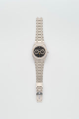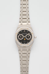 The Audemars Piguet Royal Oak reference 25594ST, introduced in the mid-1980s, represents one of the most refined evolutions of Gerald Genta’s iconic design, distinguished by its triple calendar and moonphase complication. Crafted in stainless steel, this model preserves the Royal Oak’s hallmark octagonal bezel and integrated bracelet while adding a layer of horological sophistication through its beautifully balanced dial layout. The subtle tapisserie pattern, often seen in tones of silver, grey, or blue, provides a textured backdrop for the neatly arranged day, date, month, and moonphase indications—an elegant expression of mechanical artistry within the sport-luxury framework. Powered by the ultra-thin automatic caliber, the 25594ST embodies both technical finesse and timeless design, offering a poetic blend of precision and aesthetic harmony that makes it one of the most desirable and collectible complicated Royal Oaks of its era.