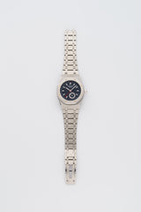 Produced briefly between around 1999 and the early 2000s, it remains — to this day — the only annual-calendar version ever offered under the Audemars Piguet “Royal Oak” line. With a 36 mm stainless-steel case and integrated bracelet, the watch carries the bold octagonal-bezel design and “Grande Tapisserie” dial pattern that made the Royal Oak legendary — here rendered in a deep, elegant blue and contrasted with clean white hour markers. Its movement (automatic calibre 2224/2814) drives an annual-calendar complication — showing date, month and weekday — a practical yet refined complication that only needs resetting once a year.