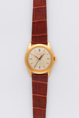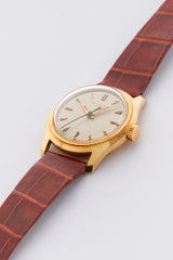 In 1952 there was a shift between the reference 565 and the present reference 2533, a decidedly rare model given its low production numbers limited to 400 total pieces. The resemblance between the two watches is remarkable: the curved design of the case is inherited from the previous model but modernized with some small details, such as the stepped bezel, usually delicate but very visible in this lot thanks to its perfect conditions of the yellow-gold case. Even the silvered dial is a great peculiarity which can be found on this watch, along with the particular arrow indexes also in yellow gold with internal radium. (MLG)