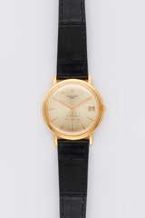 The Patek Philippe reference 3445, introduced in the early 1960s, holds the distinction of being the brand's first serially produced automatic watch with a date complication, powered by the Caliber 27-460M. This elegant timepiece embodies Patek Philippe's understated sophistication, with its clean and minimalist design, featuring a round 35mm case, dauphine hands, applied hour markers, and a subtly integrated date window at 3 o'clock. Crafted primarily in yellow gold, though also available in white gold and platinum, the 3445 is celebrated for its timeless proportions and mechanical excellence. Its automatic movement, equipped with a beautifully decorated 18k gold rotor, exemplifies Patek Philippe's dedication to precision and artistry. Today, the 3445 remains a classic choice for collectors who appreciate its historical significance and enduring elegance.
