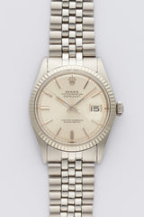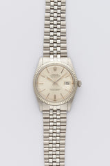 A perfect condition 1971 Rolex Oyster Perpetual Datejust, reference 1601, featuring a striking silver step dial and an 18k white gold fluted bezel. This classic timepiece is known for its timeless elegance and versatile style. This example comes on its original stainless steel folded jubilée bracelet stamped 4.70 with 55 end links complementing the stainless steel case beautifully, making it suitable for both formal and casual occasions.