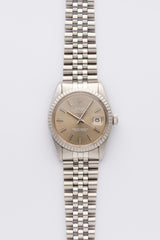 A very rare 1978 Rolex Oyster Perpetual Datejust, reference 16030 aka "stainless steel bezel" quick set featuring a striking and extremely rare Grey-Taupe Soleil dial with superb patina on chunky lume plots and matching hands.