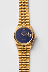 In the 1970s, Rolex introduced a strikingly luxurious variation of the Datejust by fitting select models with exotic hard stone dials, among the most coveted being the deep blue Lapis Lazuli dial. These rare Lapis Datejusts, typically housed in 18k yellow gold cases, exude a bold, minimalist elegance—characterized by a glossy, jet-blue gold-incrusted surface with no hour markers, allowing the rich stone to speak for itself. The absence of lume and textural contrast emphasizes the purity and depth of the Lapis, creating a sharp visual harmony with the warm gold case and applied gold crown at 12 o’clock. Each dial, cut from a single slab of natural stone, made every piece subtly unique and required exceptional craftsmanship due to the fragility of the material. Produced in very limited numbers, these Lapis Lazuli dial Datejusts remain highly prized today, admired for their rarity, opulence, and the perfect fusion of natural beauty and Rolex precision.