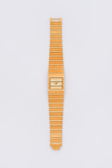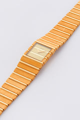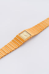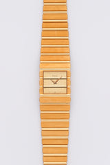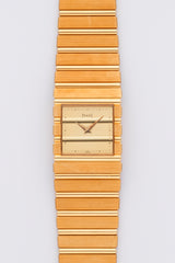 Characterized by its distinctive square case, this model departs from the traditional round Polo aesthetic while retaining the hallmark integrated bracelet with horizontal gold grooves that exude elegance and sophistication. Crafted entirely in 18k yellow gold, the watch embodies Piaget's commitment to exceptional metalwork and timeless style. Its minimalist dial, often adorned with slim hands and understated markers, highlights the brand's focus on refined simplicity. A symbol of 1980s glamour, the square Piaget Polo remains a rare and coveted piece for collectors who value its unique design and enduring legacy in the world of luxury timepieces.