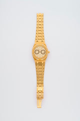 The mid-80s Audemars Piguet Royal Oak reference 5572BA is a rare and elegant expression of Gerald Genta’s iconic design, rendered entirely in solid 18k yellow gold and featuring the distinctive early Day-Date configuration often nicknamed the “Owl” for its twin apertures at 12 o’clock. This particular model showcases an off-white dial with a subtle tapisserie texture, offering a refined contrast to the richness of the gold case and integrated bracelet. Measuring a slim 36mm, the 5572BA maintains the Royal Oak’s hallmark octagonal bezel with exposed screws while incorporating a complex automatic movement—caliber 2124/2810—that powers the day and date functions. With its understated dial, luxurious materials, and collectible “Owl” layout, this reference stands as a highly coveted example of AP’s ability to merge avant-garde design with traditional haute horology.