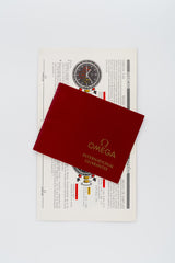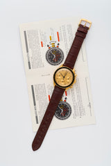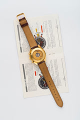 The 1989 Omega Speedmaster Reduced, reference 175.0032, in 18k yellow gold is a luxurious and uncommon iteration of Omega’s famed chronograph, offering both elegance and functionality in a more compact 39mm case. This model features a stunning gold dial that harmonizes beautifully with the warm tones of its solid gold case, creating a cohesive and opulent aesthetic rarely seen in Speedmasters. Powered by the automatic Caliber 1140, the watch retains the classic tri-compax layout and tachymeter bezel that define the Speedmaster lineage, but in a more wearable and refined format. The inclusion of the original box and papers further enhances its appeal to collectors, affirming its provenance and well-preserved condition. A rare blend of sporty heritage and precious metal luxury, this Speedmaster Reduced stands out as a unique offering from Omega’s late-1980s catalog.