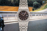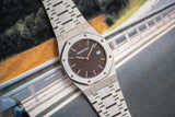 A very rare and exceptionally well-preserved unpolished stainless steel 1990s Audemars Piguet Royal Oak Mid-size 33mm with a warm patina on a perfect condition famous Audemars Piguet petite tapisserie grey dial with matching hands. The watch is in excellent condition showing light signs of age and or scratches. All watches are checked by our watchmaker and guaranteed 3 months, 1 year if serviced. This reference has been serviced and is mechanically guaranteed 1 year.
