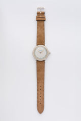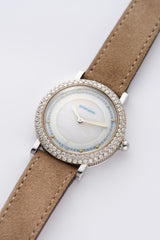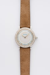 An extremely rare and highly collectible, 18k white gold, jumbo 36mm Gérald Genta "Time only" Diamond-Set Bezel, reference G3703.7 from the 1990s, in absolute stunning condition with perfect patina on tritium indexes and matching hands. This remarkable timepiece features a fantastic -no cracks and no hairlines- "Mother of Pearl" dial adding a unique touch of elegance and artistry. Designed by the legendary watchmaker Gérald Genta, this "Time only" example is renowned for its distinctive and daring designs, and the "Mother of Pearl" dial exemplifies Genta’s masterful approach to luxury watchmaking.