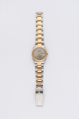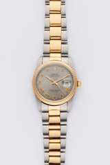 A perfect condition 1994 Rolex Oyster Perpetual Datejust, reference 16233 in both 18k yellow gold and stainless steel, featuring a striking golden roman numerals grey dial. This classic timepiece is known for its timeless elegance and versatile style. The combination of stainless steel and 18k yellow gold, complements the "tuxedo-like" grey dial beautifully, making it suitable for both formal and casual occasions.
