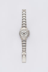 The white dial with "T Swiss Made T" markings is notable because it signifies the use of tritium, a luminous material that Rolex began to phase out in favor of Luminova around 1998. The dial’s white hue, accented by black sub-dial rings, gives it a timeless yet strikingly modern look that has made this model especially desirable. Over time, the tritium has likely acquired a light creamy patina, complementing the original hands and enhancing the watch's vintage appeal.