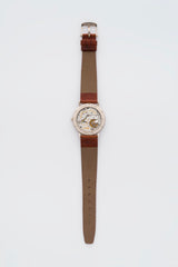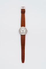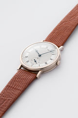 Crafted in 18k white gold, the case exudes understated luxury with its slender profile and signature coin-edge fluting along the caseband. The highlight of this timepiece is its exquisite guilloché-engraved silvered dial, meticulously hand-turned to create intricate patterns that catch the light beautifully, framed by elegant black Roman numerals and Breguet’s trademark blued steel hands. Powered by a finely finished manual-wind movement visible through a sapphire caseback, this reference maintains a sleek, thin silhouette that sits comfortably under a cuff, emphasizing its role as a sophisticated dress watch. A timeless homage to Breguet’s horological legacy, this watch balances classic aesthetics with technical finesse.