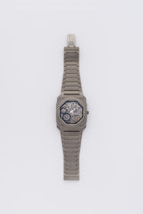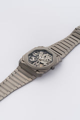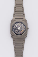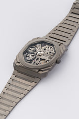An exceptionally Titanium Bvlgari Octo Finissimo "Skeleton" reference 102714 fairly new from 2022. This 40mm ultra-thin masterpiece features a captivating skeletonized dial, revealing the intricate hand-wound BVL 128SK movement, which measures a mere 2.35mm in thickness. Offering an impressive 65-hour power reserve, it also includes a power reserve indicator for effortless monitoring, making it a true marvel of contemporary horology.