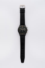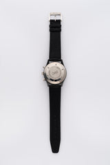 The IWC Pilot’s Chronograph Ceramic reference 3705, released in the mid-1990s, is a cult classic that was far ahead of its time. As one of the very first wristwatches to feature a case made from black zirconium oxide ceramic, the 3705 was a bold and innovative departure from traditional stainless steel tool watches. Its stealthy matte finish not only offered superior scratch resistance but also gave the watch a distinct tactical presence that perfectly complemented its pilot’s watch DNA. Powered by the robust Valjoux 7750-based IWC caliber 7922, the 3705 combined reliability with a clean, legible dial layout featuring bold Arabic numerals, day-date function, and tri-compax chronograph subdials. Initially met with lukewarm commercial reception, only 999 examples + 1 prototype were produced, making it a true sleeper hit in the collecting world. Today, the 3705 is celebrated as a visionary piece—an under appreciated icon that anticipated the modern era of ceramic sports watches.