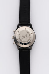 A fantastic and extremely rare "New old stock" -NOS- condition 1994 IWC Pilot Fliegerchronograph in ceramic OG reference 3705, featuring a striking black matte dial with light patina and matching hands. This example is new old stock -as it left the factory- and comes with its original IWC leather band, original IWC buckle and Original IWC papers and documents.