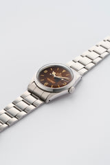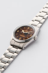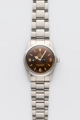 The reference 1016, is a breathtaking example of vintage allure, distinguished by its highly sought-after tropical brown dial. Originally black, the dial has aged over decades into a rich, warm brown hue—a natural transformation prized by collectors for its uniqueness and character. The iconic 3-6-9 Explorer layout remains crisp, offering perfect contrast against the beautifully patinated surface. Housed in a classic 36mm stainless steel case, this Explorer embodies the rugged elegance and understated sophistication that defines the model. A true time capsule, this tropical-dial 1016 is more than a watch—it's a rare testament to Rolex history and the beauty of time’s passage.