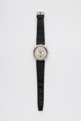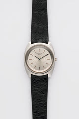 Featuring a sleek tonneau (barrel-shaped) case crafted from stainless steel—a departure from Patek Philippe’s more common use of precious metals—this reference embodies both elegance and a sporty edge. Its minimalist silver dial, adorned with simple stick markers and baton hands, emphasizes clarity and restraint, hallmarks of 1970s watch aesthetics. Powered by a manual-winding movement, the 3579 combines technical precision with a quietly bold design, making it a prized collector’s item for enthusiasts of vintage Patek Philippe and unconventional case shapes.