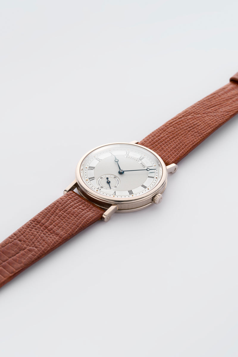 Crafted in 18k white gold, the case exudes understated luxury with its slender profile and signature coin-edge fluting along the caseband. The highlight of this timepiece is its exquisite guilloché-engraved silvered dial, meticulously hand-turned to create intricate patterns that catch the light beautifully, framed by elegant black Roman numerals and Breguet’s trademark blued steel hands. Powered by a finely finished manual-wind movement visible through a sapphire caseback, this reference maintains a sleek, thin silhouette that sits comfortably under a cuff, emphasizing its role as a sophisticated dress watch. A timeless homage to Breguet’s horological legacy, this watch balances classic aesthetics with technical finesse.