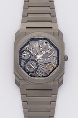An exceptionally Titanium Bvlgari Octo Finissimo "Skeleton" reference 102714 fairly new from 2022. This 40mm ultra-thin masterpiece features a captivating skeletonized dial, revealing the intricate hand-wound BVL 128SK movement, which measures a mere 2.35mm in thickness. Offering an impressive 65-hour power reserve, it also includes a power reserve indicator for effortless monitoring, making it a true marvel of contemporary horology.